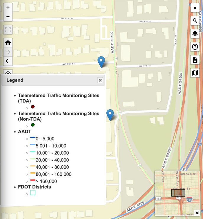 The map shows the Average Annual Daily Traffic (AADT) around 4340 NW 7th Ave, Miami, FL, with traffic counts ranging from 20,001 to 40,000 vehicles daily. This high visibility makes it an ideal spot for impactful murals/outdoor advertisement, providing excellent exposure to a large audience.